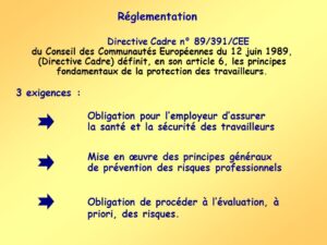En résumé, la Directive 89/391/CEE de l’Union européenne constitue un cadre essentiel pour la mise en œuvre des normes de sécurité en matière de santé et de sécurité au travail. Elle insiste sur la prévention des risques, la participation active des travailleurs et l’évaluation régulière des risques pour garantir un environnement de travail sain et sûr. Ces principes sont cruciaux non seulement pour prévenir les accidents physiques, mais aussi pour lutter contre les risques psychosociaux qui peuvent affecter la santé des employés.
