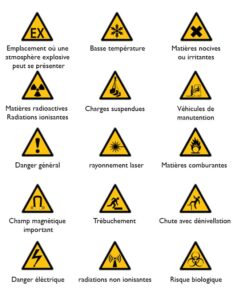 Avertissement : Triangulaires, fond jaune, bordure noire, pictogramme noir. (Ex: Danger électrique)